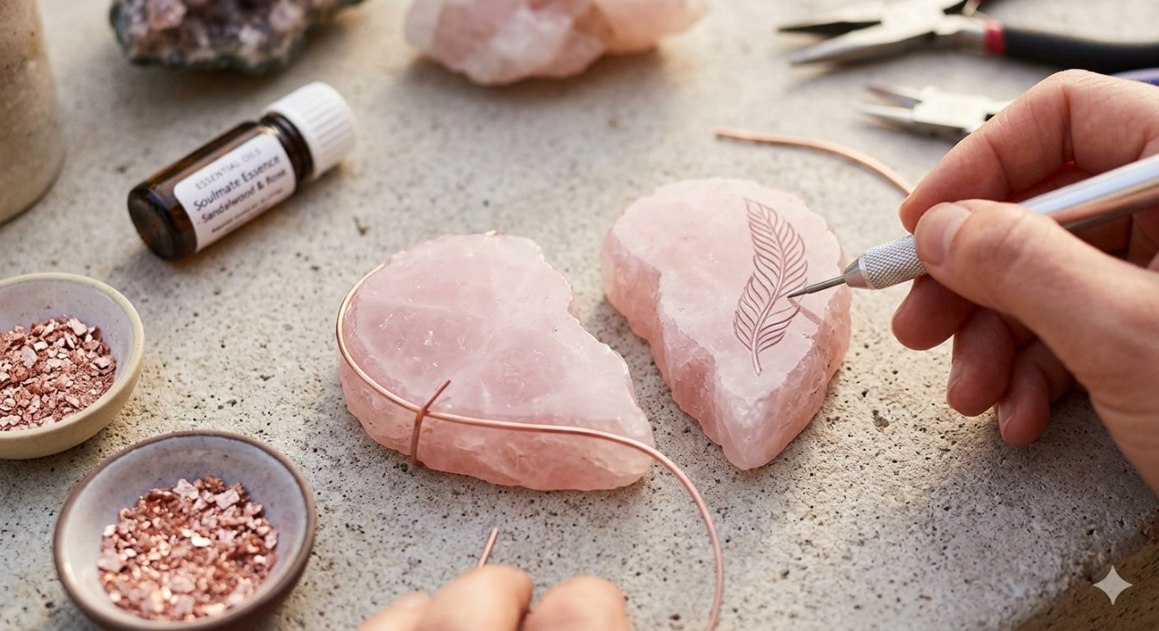 Tạo hai nửa trái tim thạch anh hồng ghép lại, tượng trưng cho sự gắn kết. Phù hợp làm quà tặng cho cặp đôi hoặc bạn thân.